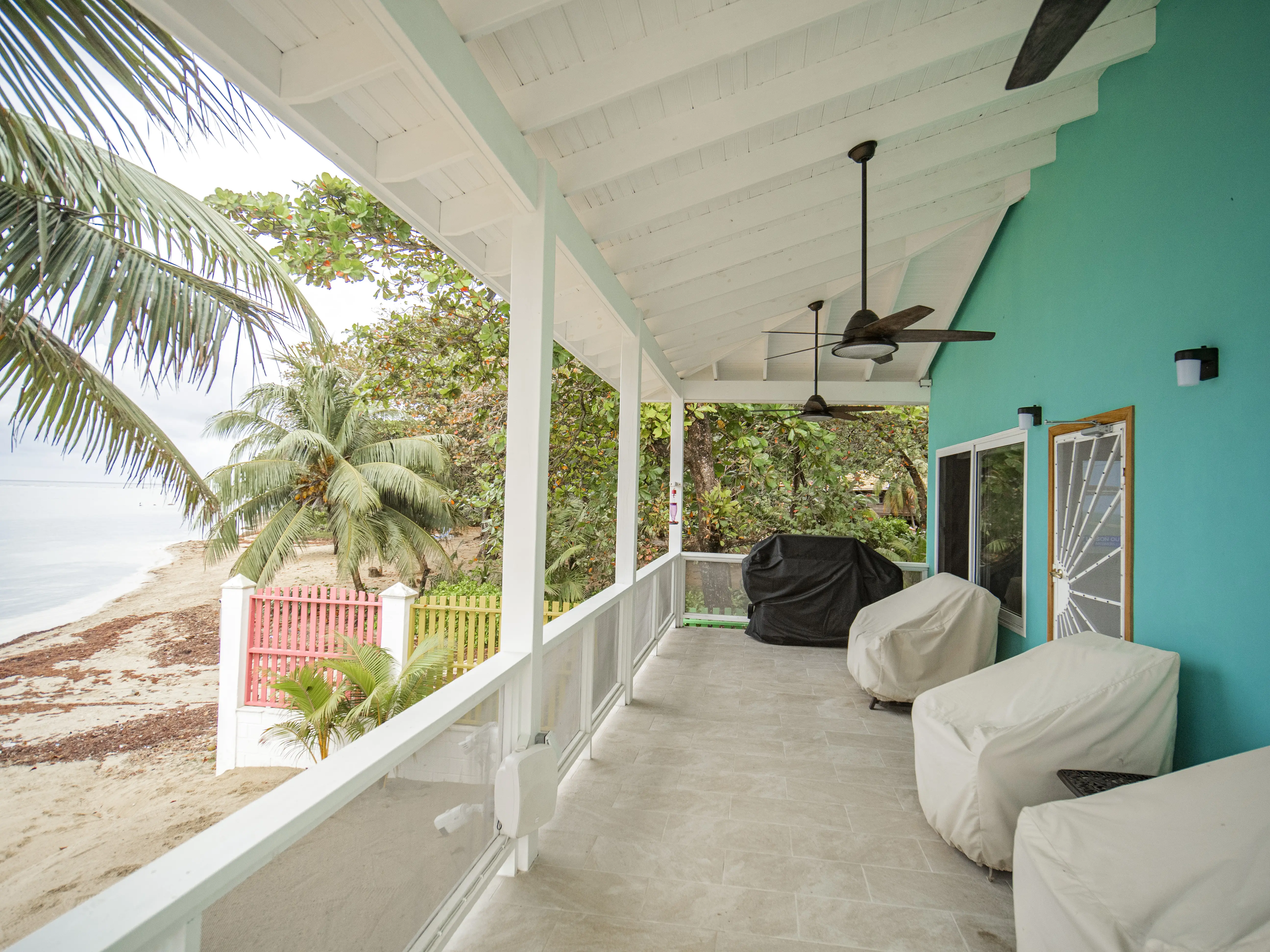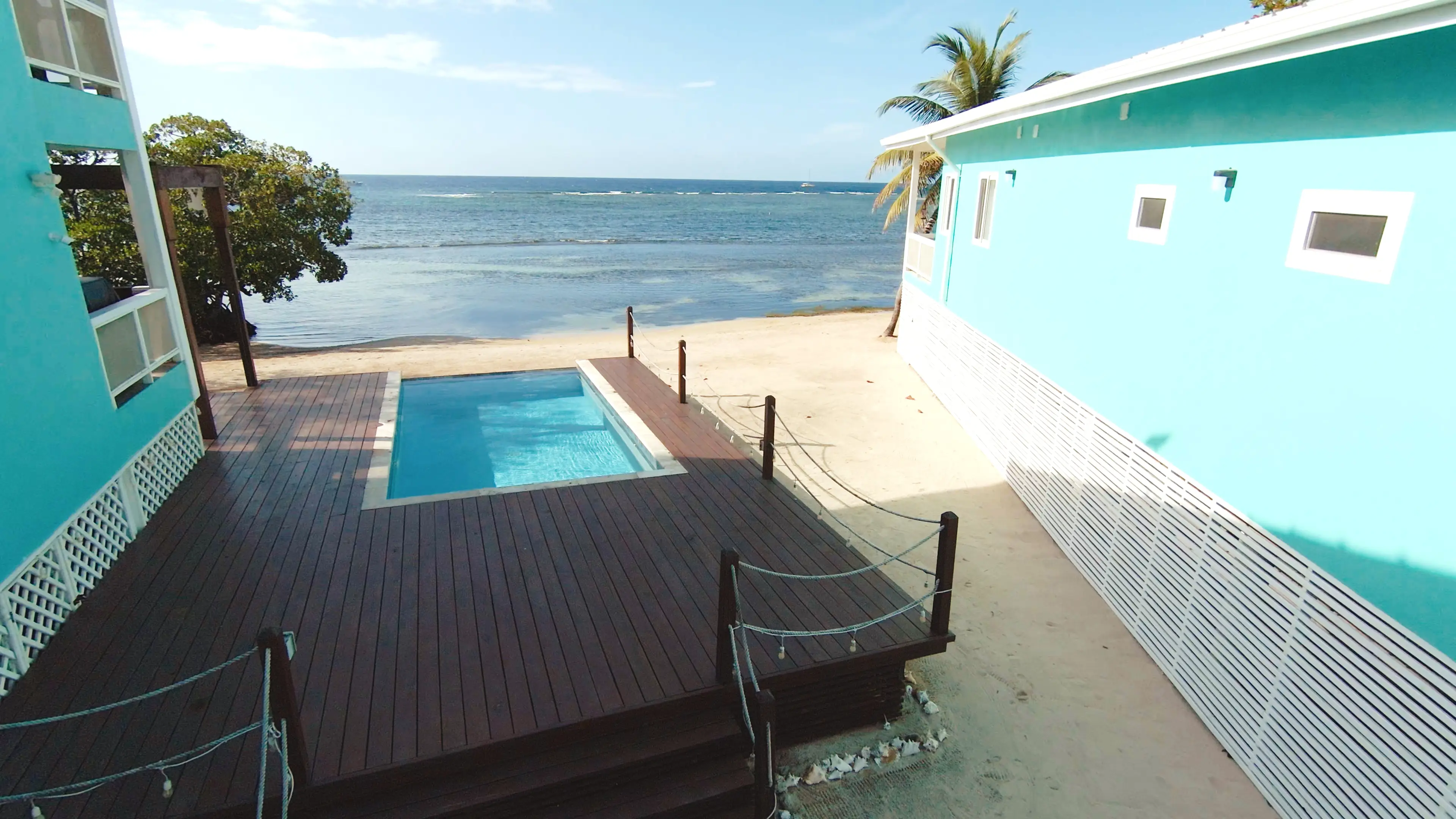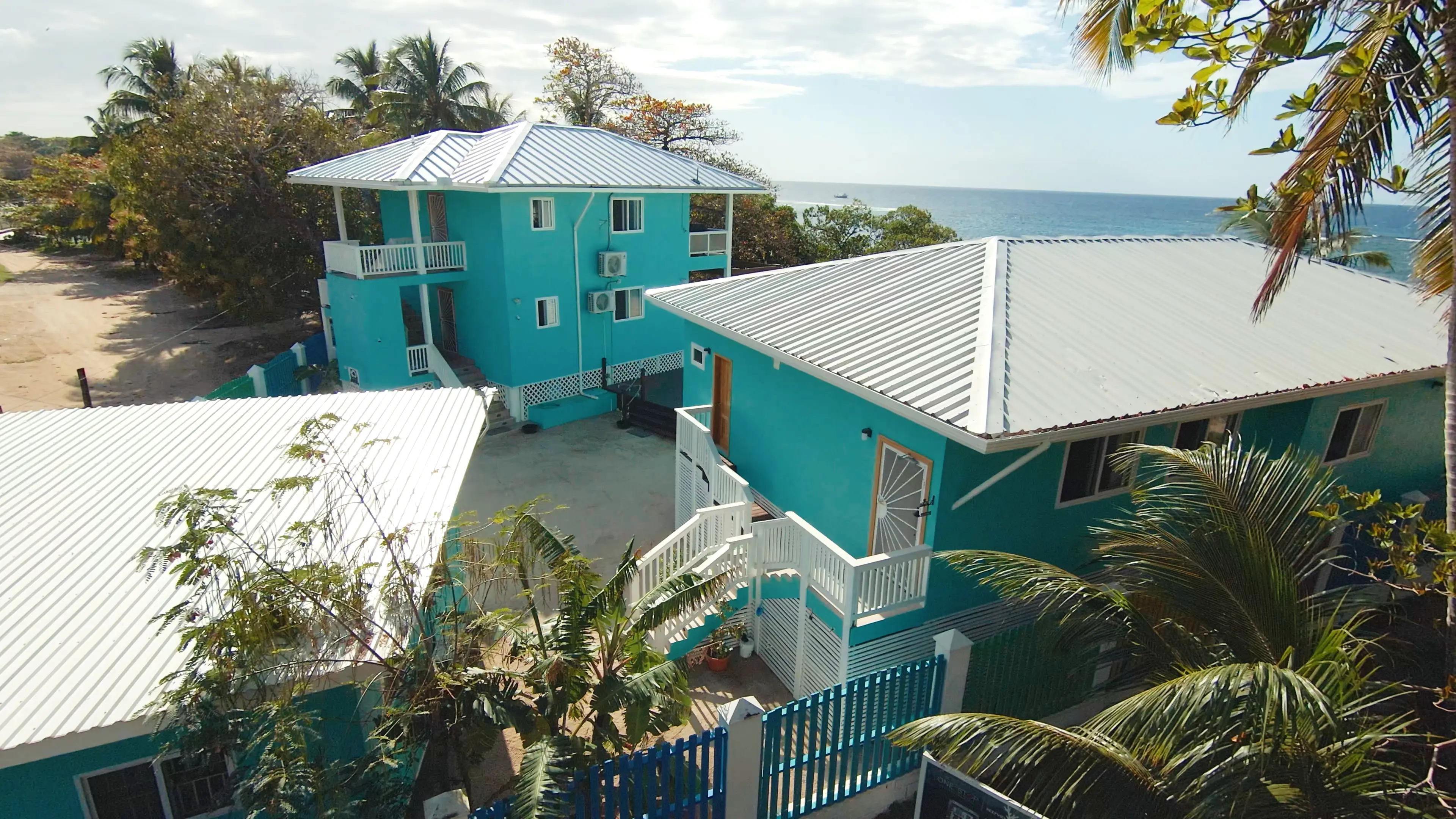 The final compound consists of two rental casitas, a bodega (workshop), a pool with a deck area, and their home. The project is located beachfront in the Gibson Bight/Sandy Bay area of Roatan.