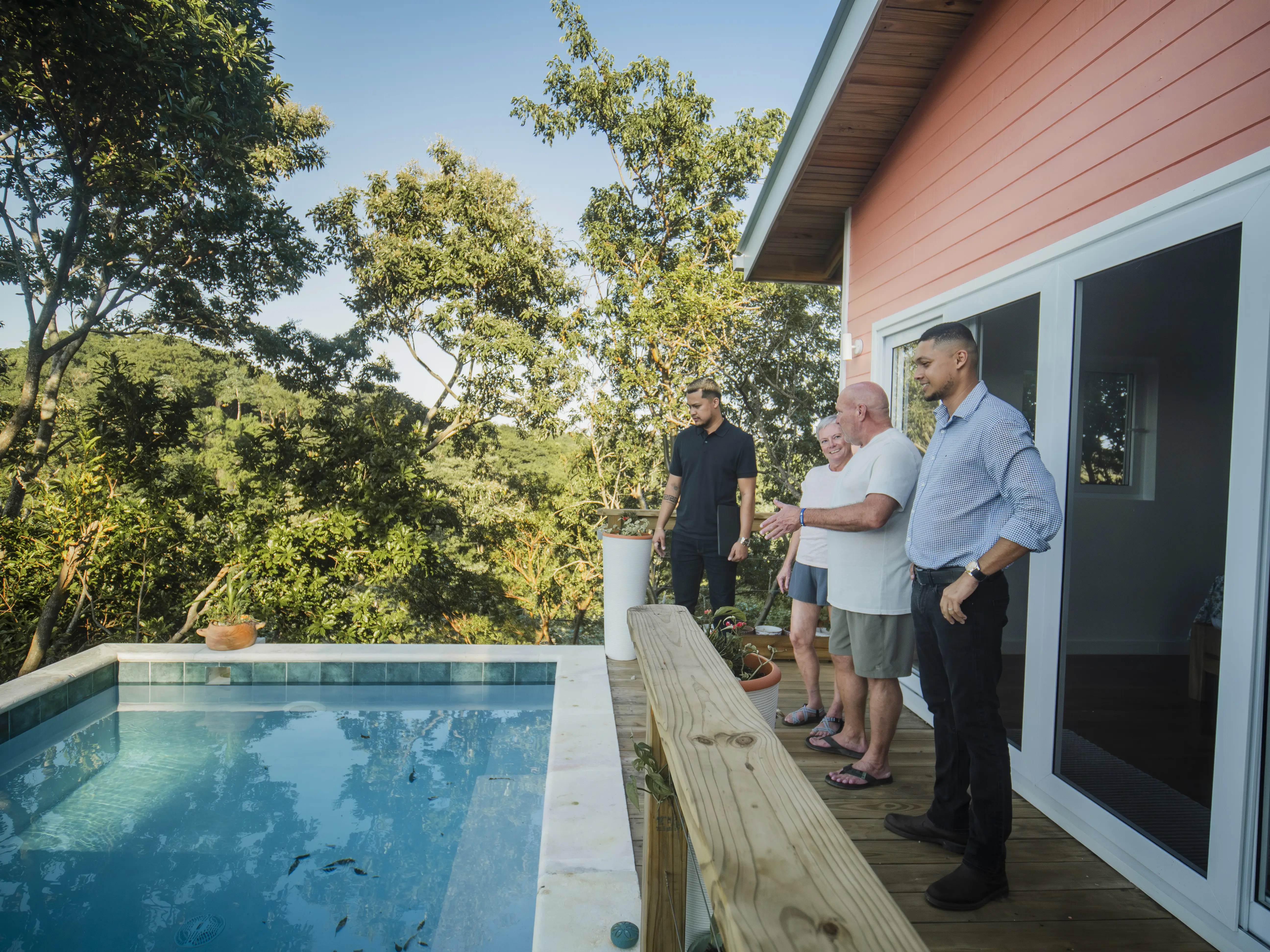 A retired couple shares their positive experience working with the Colins Development team in Roatan. After deciding to move somewhere warm for retirement, they purchased land in Roatan and needed to build their own home due to odd layouts in existing properties. The customer recounts a challenging pool construction project where the Collins team had only a couple of weeks between rentals to complete the work. Despite facing 21.3 inches of rain in two days, the crew worked under tarps to stay on schedule and delivered everything on time with no budget surprises. The final house project was delivered ahead of time and on-budget. The customer praises the team's reliability, respectfulness, punctuality, cleanliness, and their tendency to under promise and over deliver.